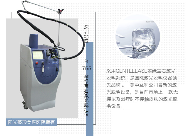 A:首先是阳光医院引进的翠绿宝石激光脱毛系统为医疗美容激光产品制造商生产的,脱毛舒适干净是激光脱毛系统。其次是深圳拥有;755翠绿宝石激光脱毛系统,技术优秀效果佳,相对造价较贵,目前深圳地区只有阳光整形美容医院拥有;较后是效果优越;采用755翠绿宝石激光脱毛可大大提高脱毛速度,减低脱毛时间和脱毛次数,加上DCD冷却系统非接触式治疗,脱毛干净、速度、又舒适。